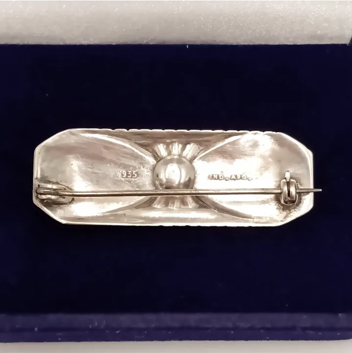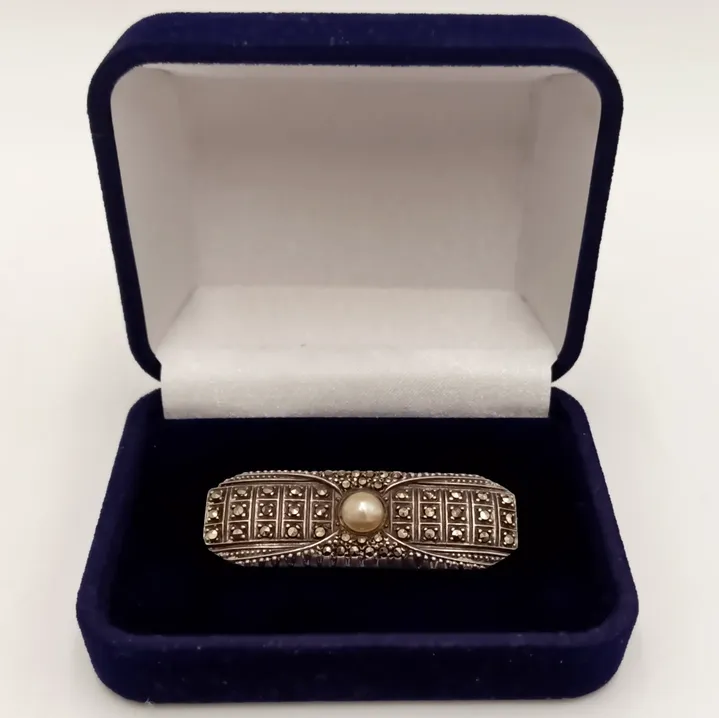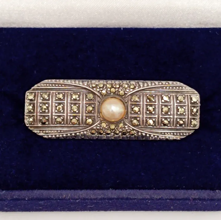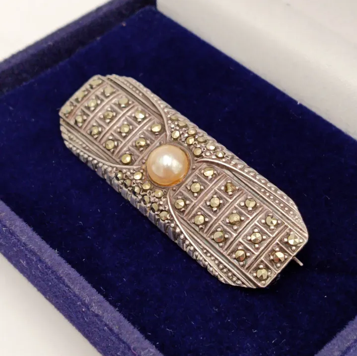 Magnífico broche francés de plata antigua 935 y marquesitas. Mide 1,6 cm de ancho x 4,7 cm de largo.